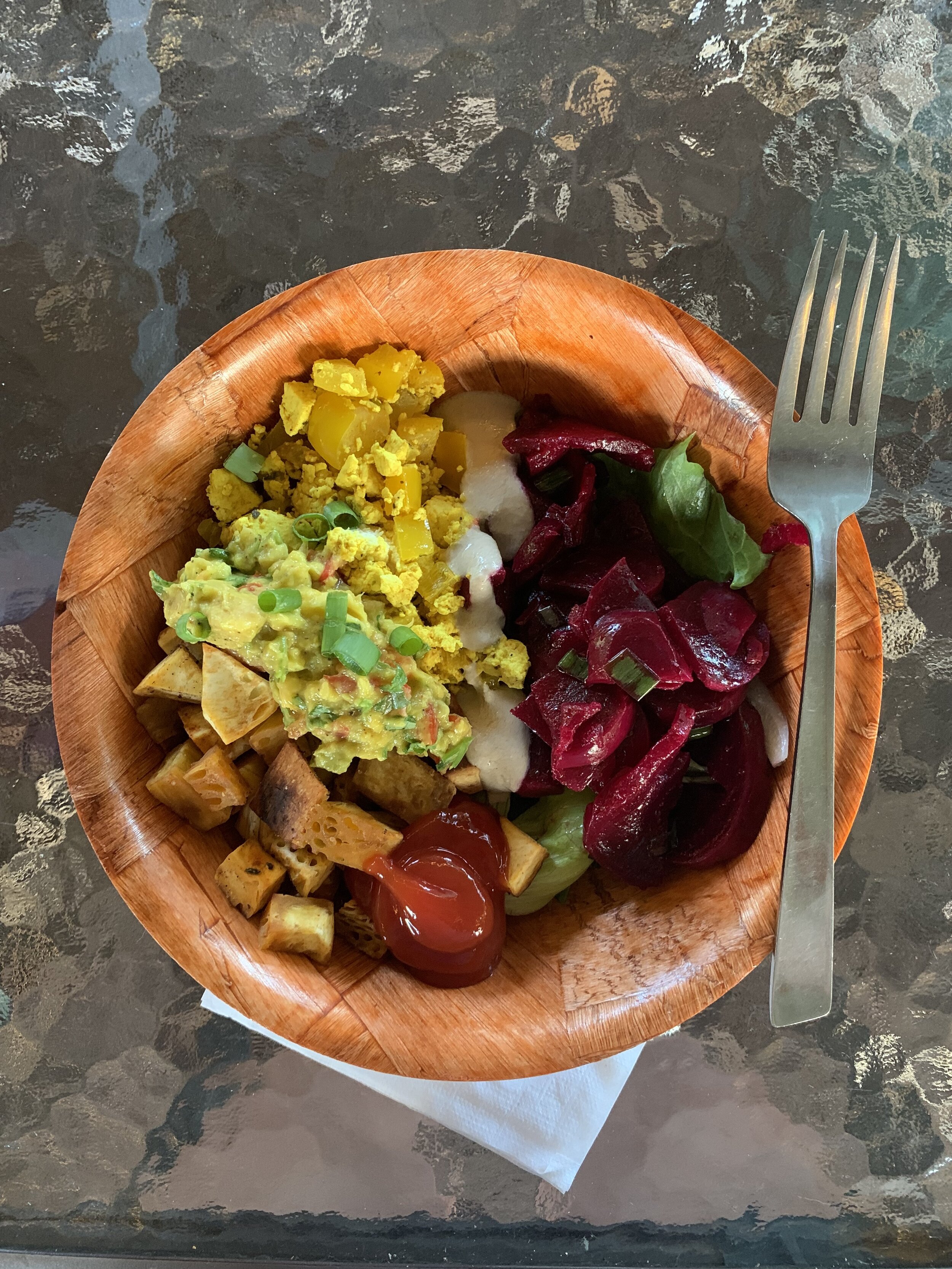Tomatoes, Maui onion, basil, and tofu “mozzarella”.